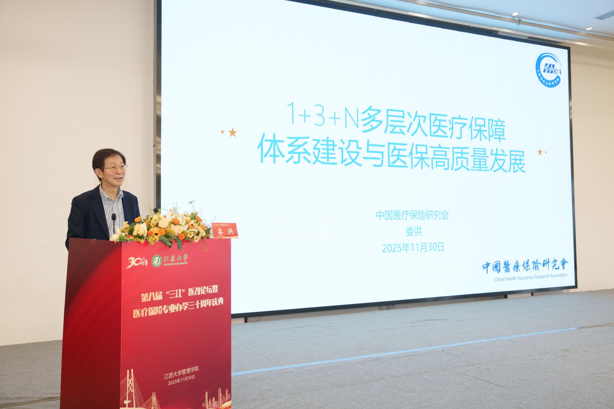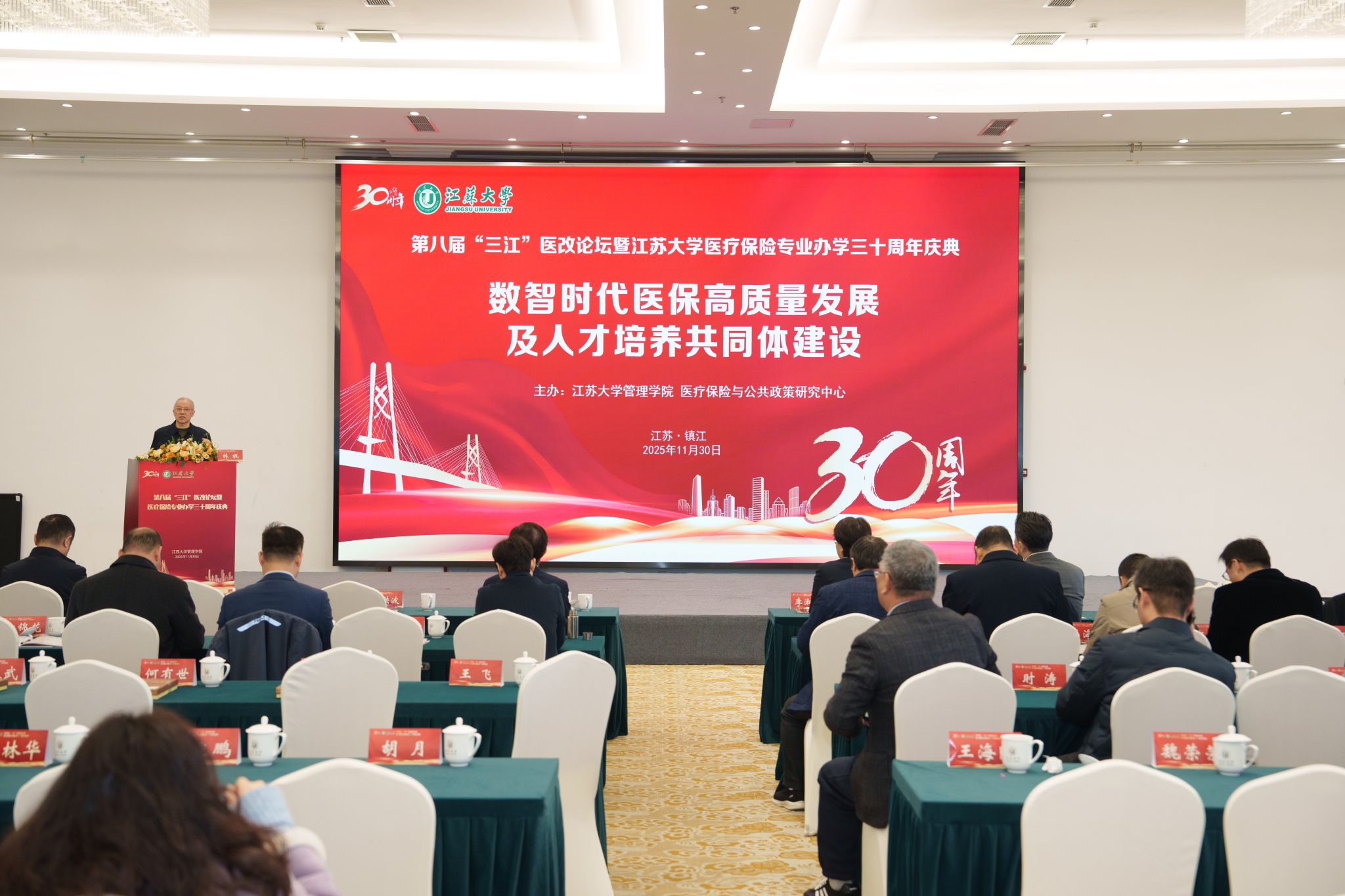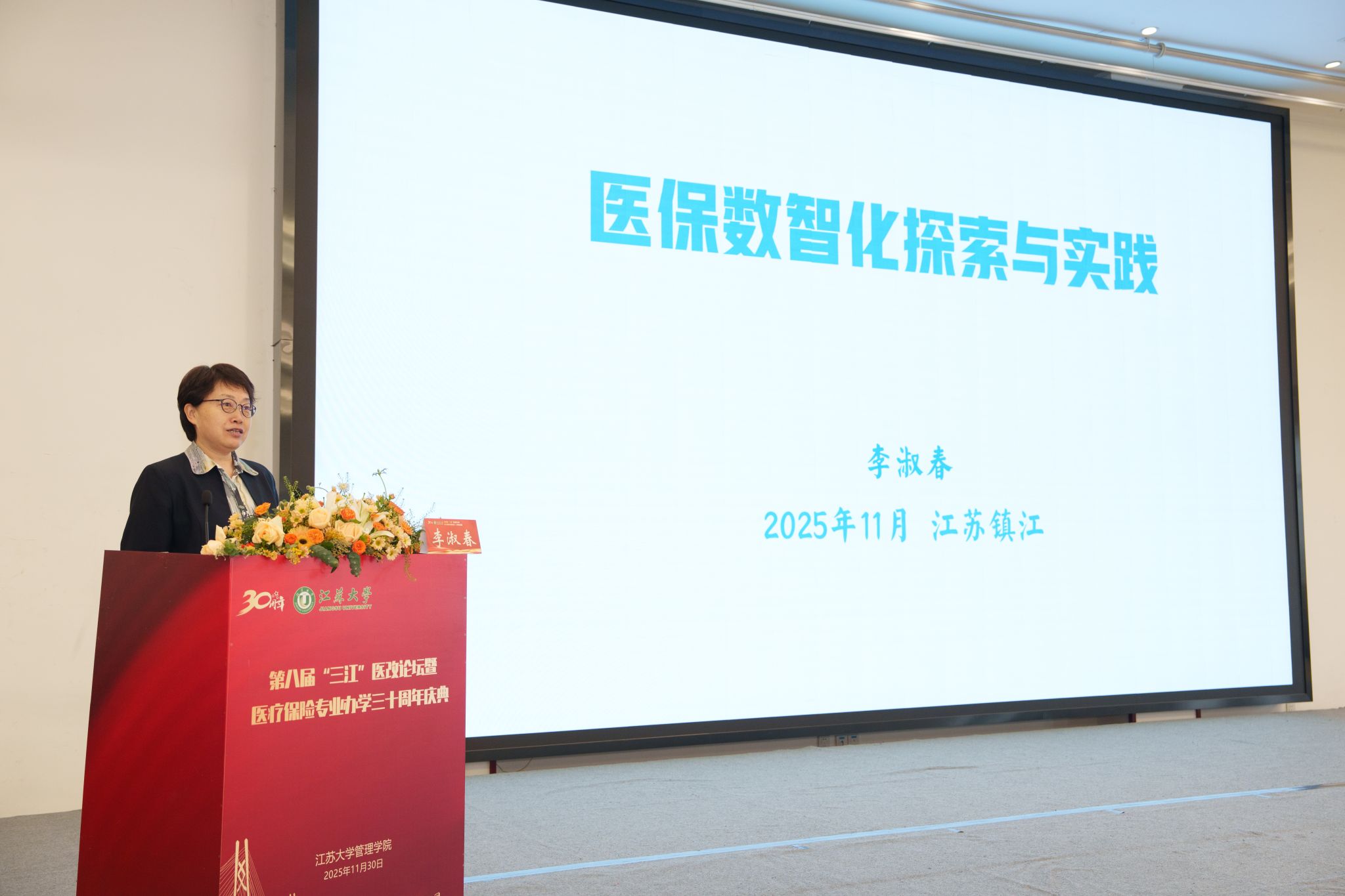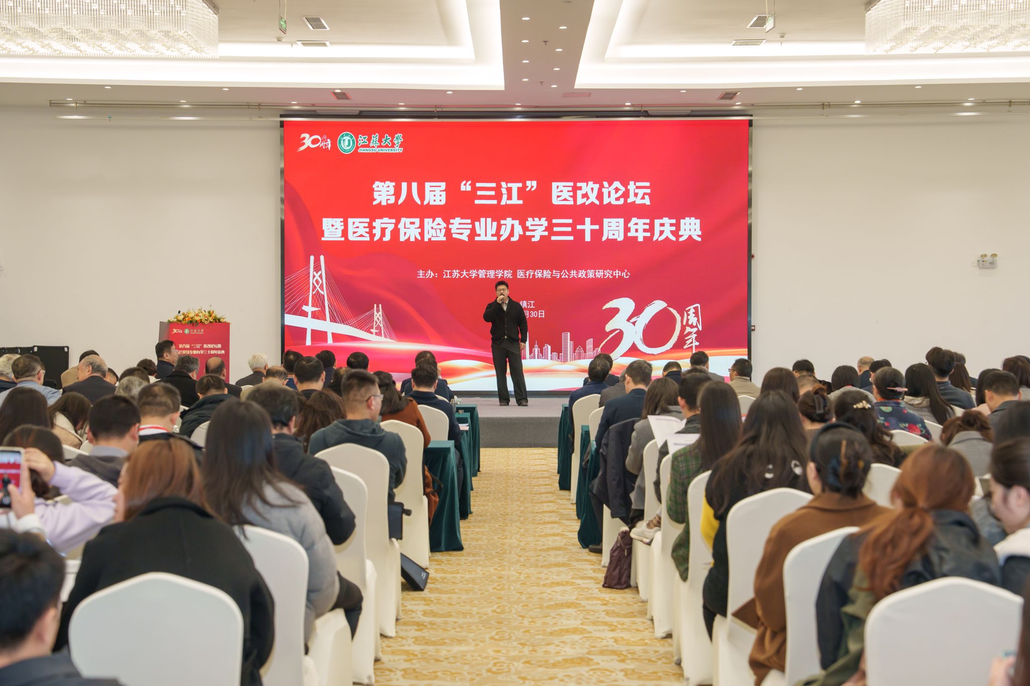 11月30日,第八届“三江”医改论坛暨江苏大学医疗保险专业办学30周年庆典在江苏大学举行。江苏大学党委书记李洪波、中国医疗保险研究会副会长、国务院参事室特约研究员、国家医疗保障研究院院长娄洪,国家医保局医药管理司原副司长李淑春,国家卫健委卫生发展研究中心医药卫生技术评估与创新发展部部长顾雪非研究员,以及来自全国40余所开设医疗保险相关专业高校的代表、校内外嘉宾、江苏大学医保专业校友和在校师生共300余人参加了活动。江苏大学管理学院院长朱永跃主持庆典仪式。