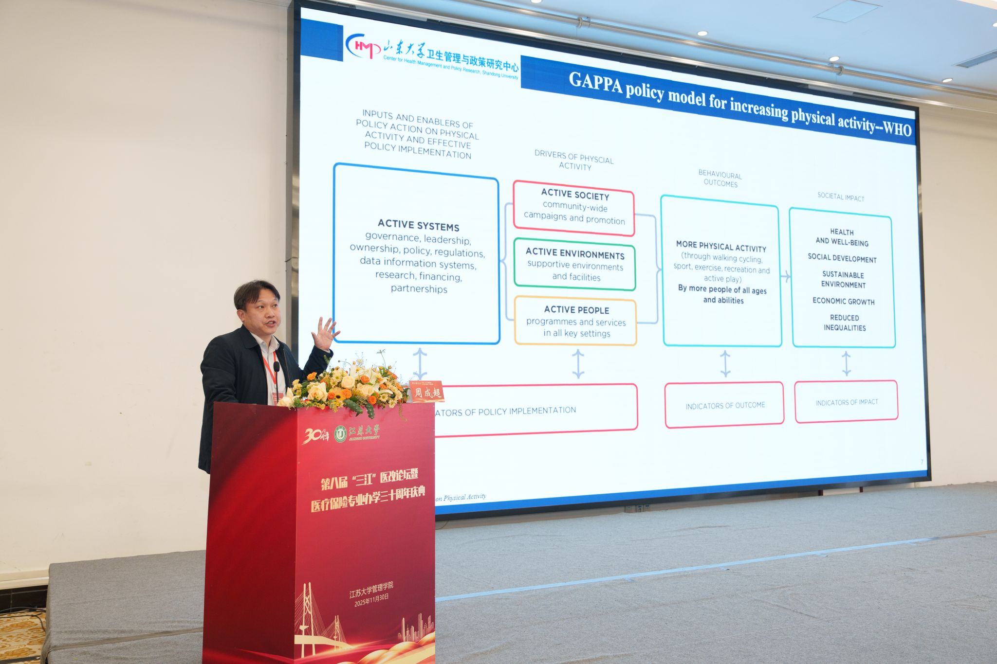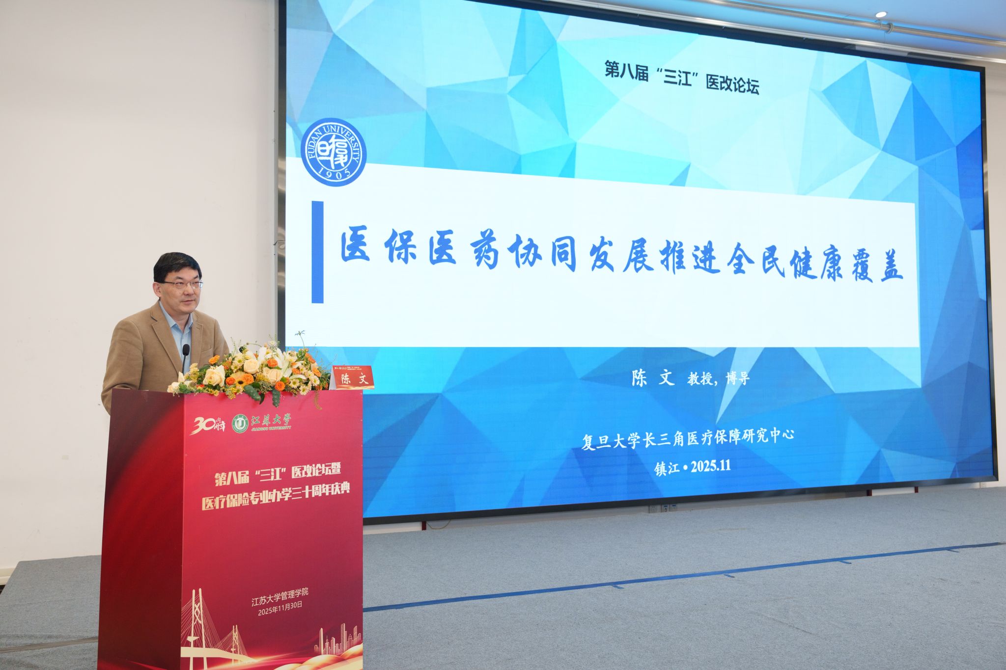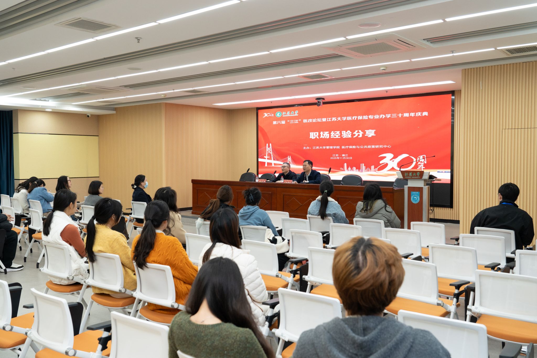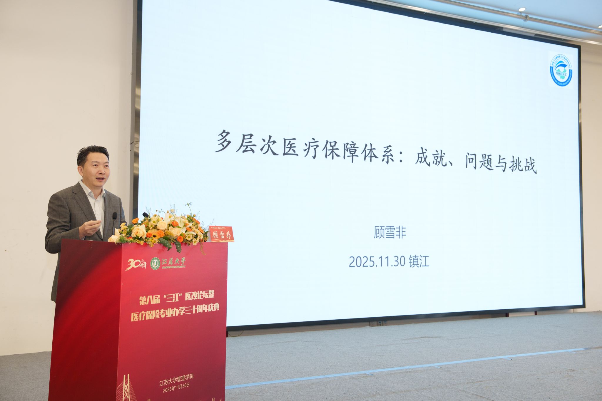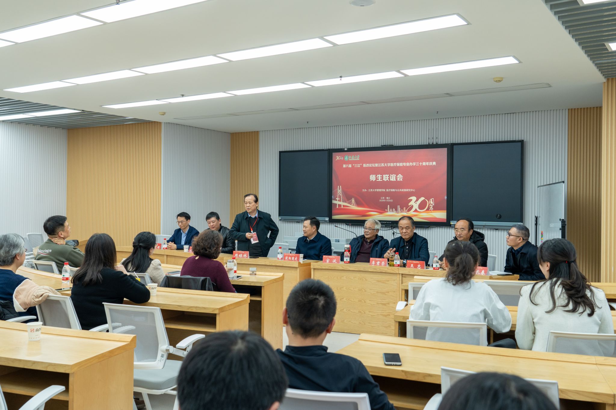 11月30日,第八届“三江”医改论坛暨江苏大学医疗保险专业办学30周年庆典在江苏大学举行。江苏大学党委书记李洪波、中国医疗保险研究会副会长、国务院参事室特约研究员、国家医疗保障研究院院长娄洪,国家医保局医药管理司原副司长李淑春,国家卫健委卫生发展研究中心医药卫生技术评估与创新发展部部长顾雪非研究员,以及来自全国40余所开设医疗保险相关专业高校的代表、校内外嘉宾、江苏大学医保专业校友和在校师生共300余人参加了活动。江苏大学管理学院院长朱永跃主持庆典仪式。
