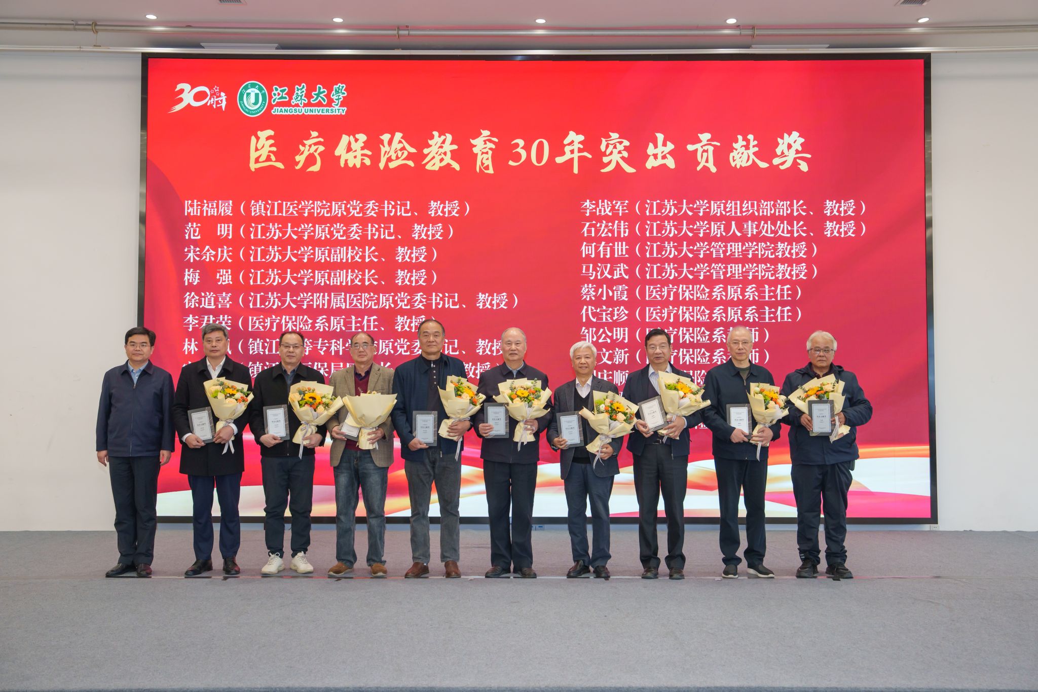 李洪波为9位获奖代表颁发“医疗保险教育30年突出贡献奖”。