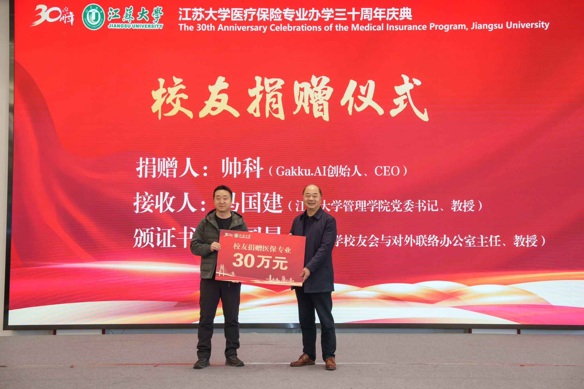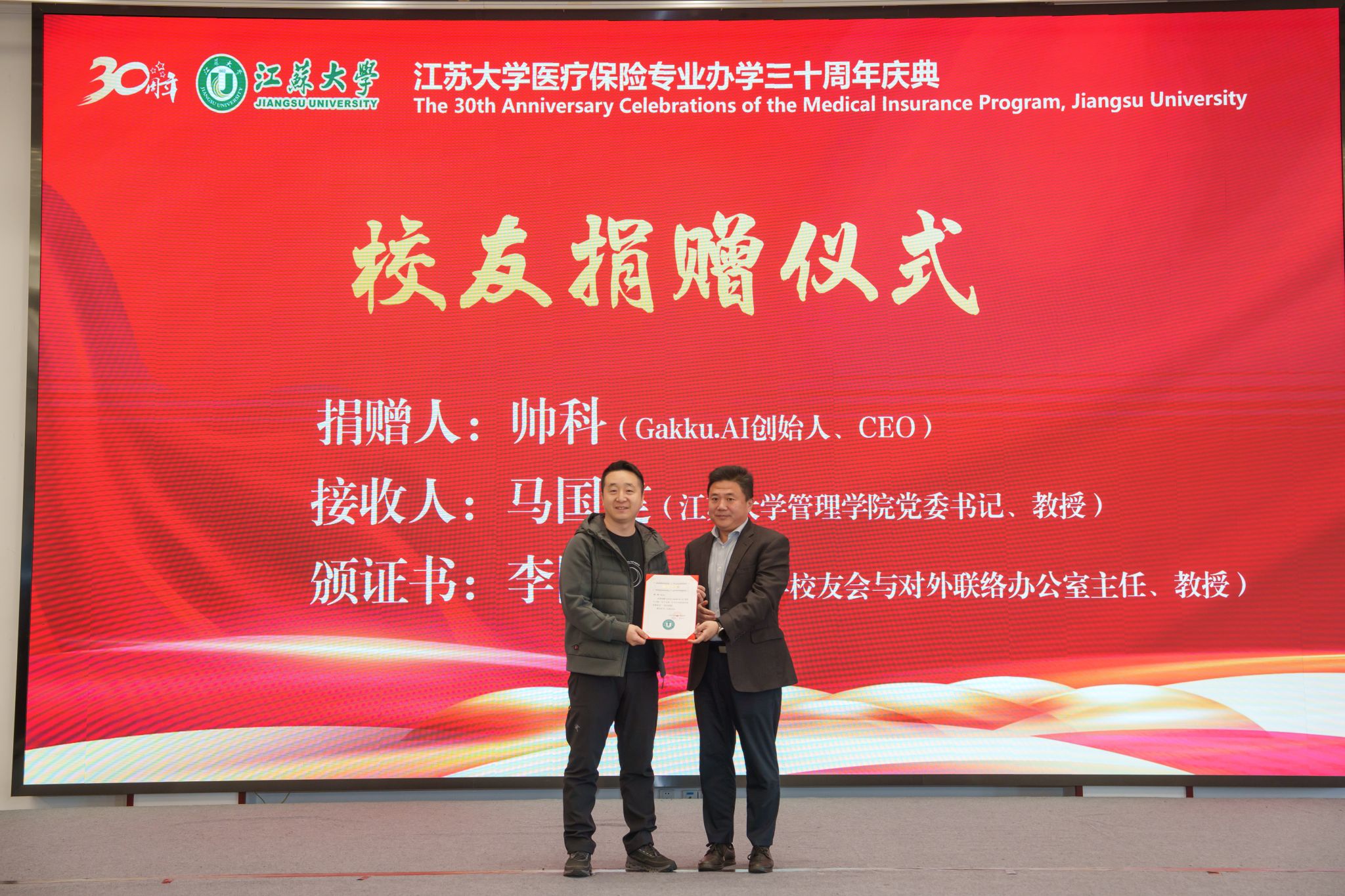 医保2002级校友、猿辅导在线教育公司联合创始人、Gakku.AI创始人兼CEO帅科向医保专业捐赠30万元,用于支持人才培养与专业建设。管理学院党委书记马国建代表学院接受捐赠,江苏大学校友会与对外联络办公室主任李国昊向帅科颁发捐赠证书。