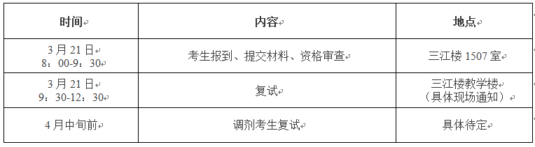 复试内容包括考生报考资格审查、复试科目考核、综合能力面试、外语听说能力测试等。复试总分为100分,包括复试科目考核(占30%)、综合能力面试(占60%)、外语听说能力测试(占10%),均实行百分制。